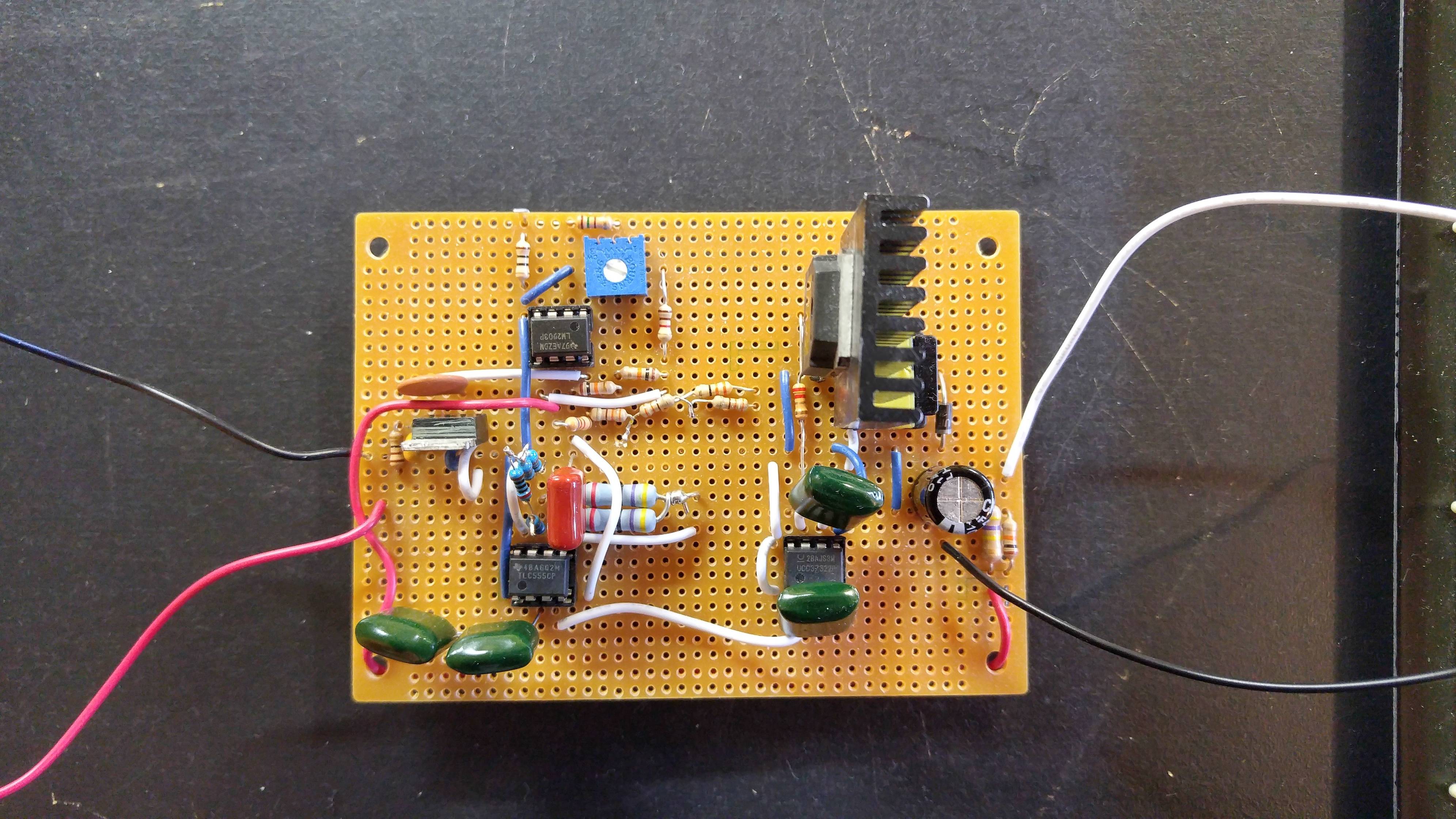 | Instead of the diode, MOSFET, and LTC6752 comparator shown, I used a UF4007 diode, a IRFP250 MOSFET, and a LM2903 dual comparator. The 7.68V rail was supplied via a LM7808 linear regulator (which was setup with a 0.1 uF capacitor between GND and the 7.68V output). |