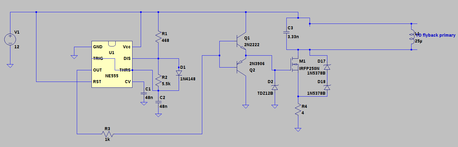 | D2, D17 and D18 are TVS diodes selected for the specific MOSFET being used for switching, and the 25uH inductor represents the primary of the flyback transformer as measured with a cheap LCR meter. Note that the 4 ohm resistor can get rather warm after extended operation. |