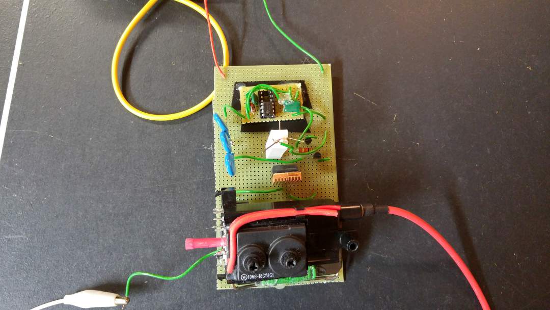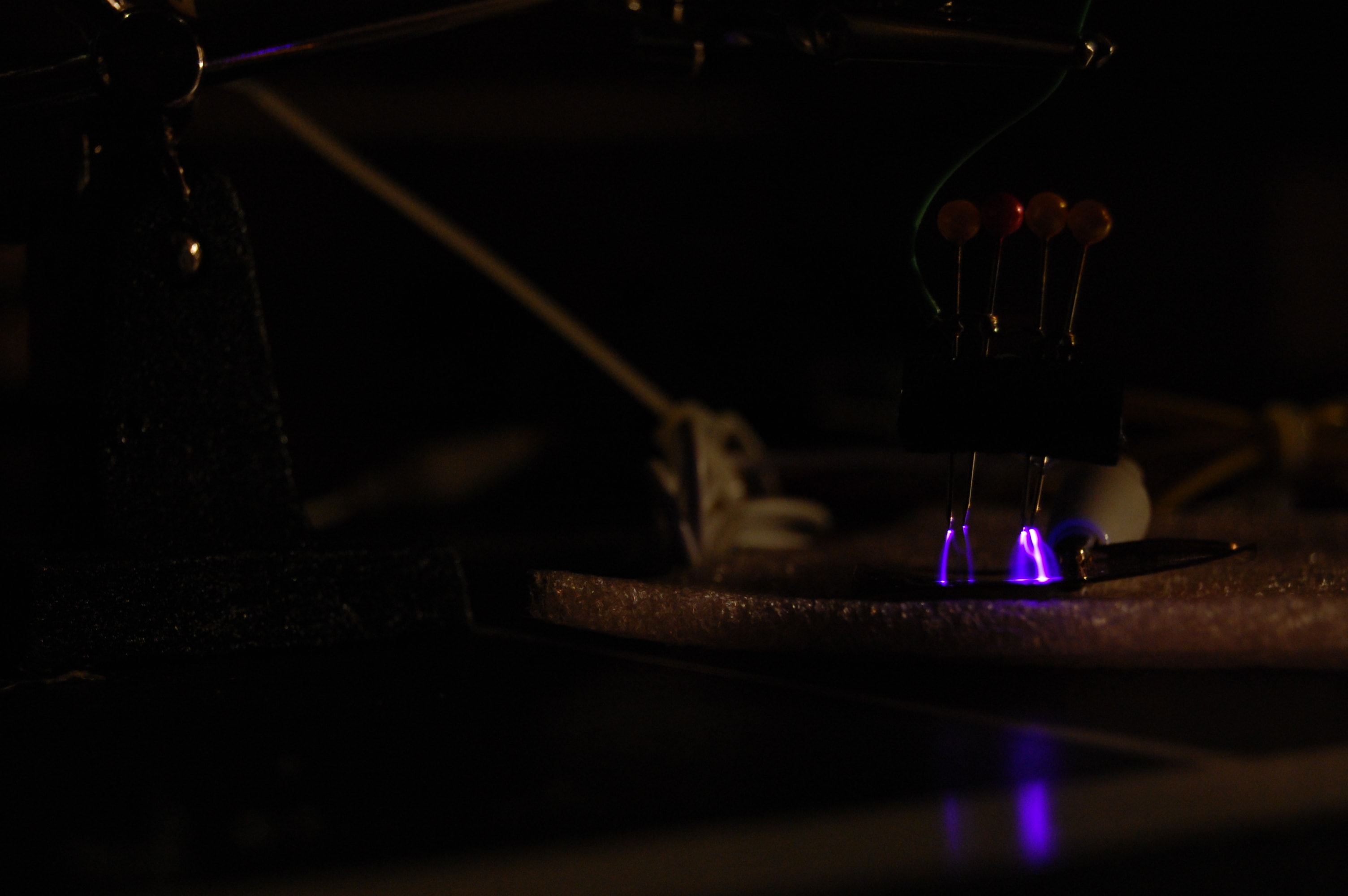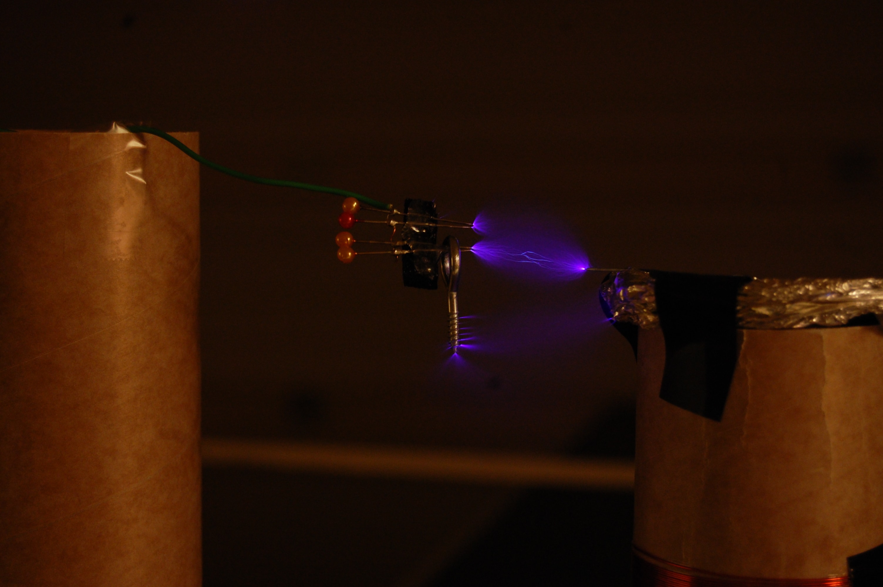 | The flyback transformer secondary was connected to some sewing needles while being driven by the 555 circuit to demonstrate the high-voltage output. |